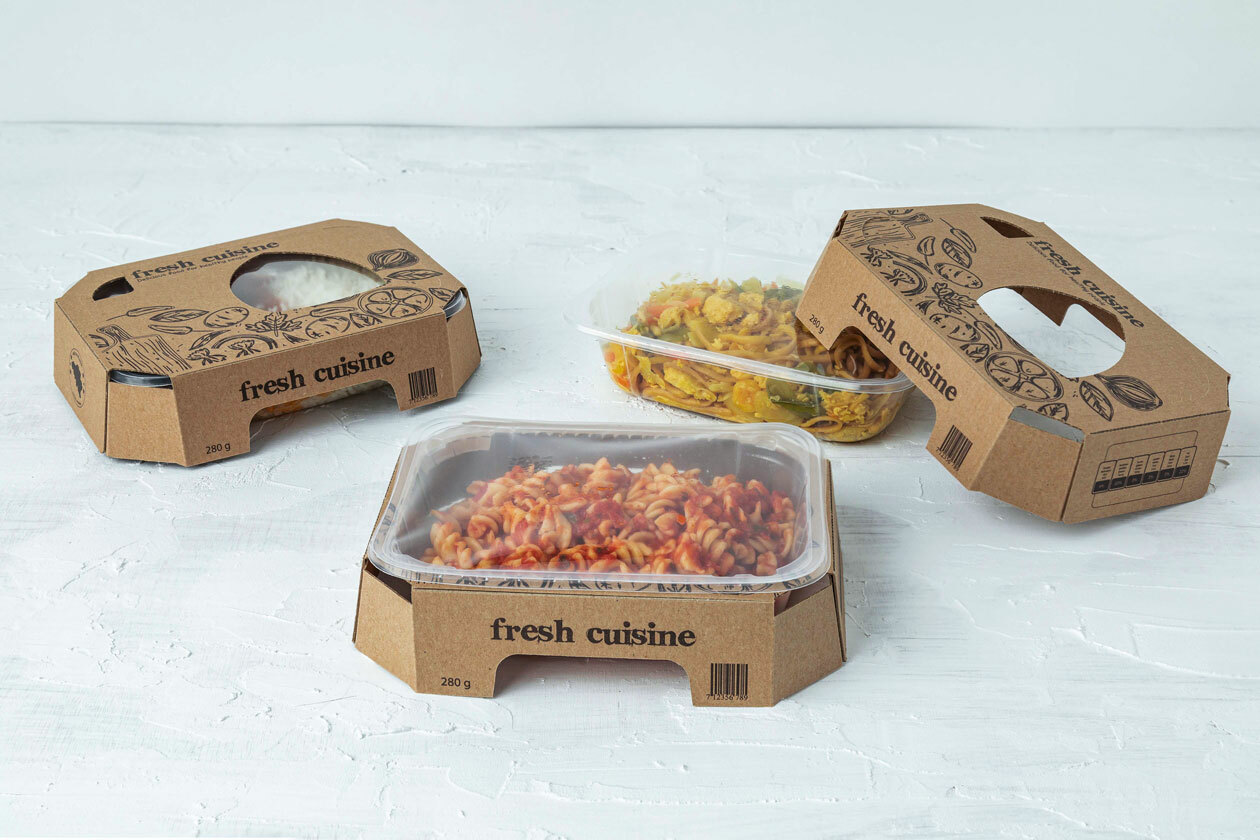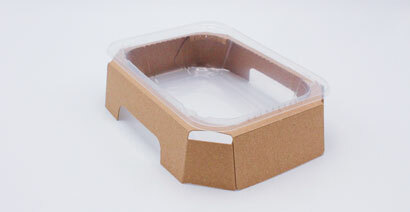 Barquette scellée optimisée combinée à une barquette en carton. Les deux éléments sont couplés mécaniquement, de sorte qu'il n'y a pas d'autre élément de fermeture.